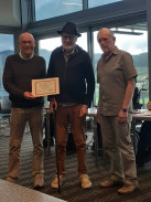 Image Description: L-R - Alan Woodside (left) hands the Andy Woodside Memorial Award certificate to Nick Brandon (centre), with President Steve McCloskey to his right..